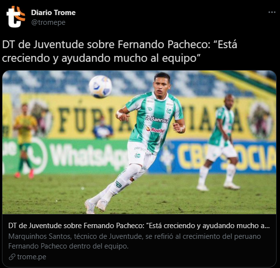 Trabajando en silencio se hace un espacio dentro del primer equipo. Fernando Pacheco esta temporada llegó al Juventude de la primera división, en condición de préstamo por parte del Fluminense. El ex Sporting Cristal no estuvo en los planes del primer equipo ‘fluzao’, por eso una salida inmediata y productiva era el préstamo a un recién ascendido.