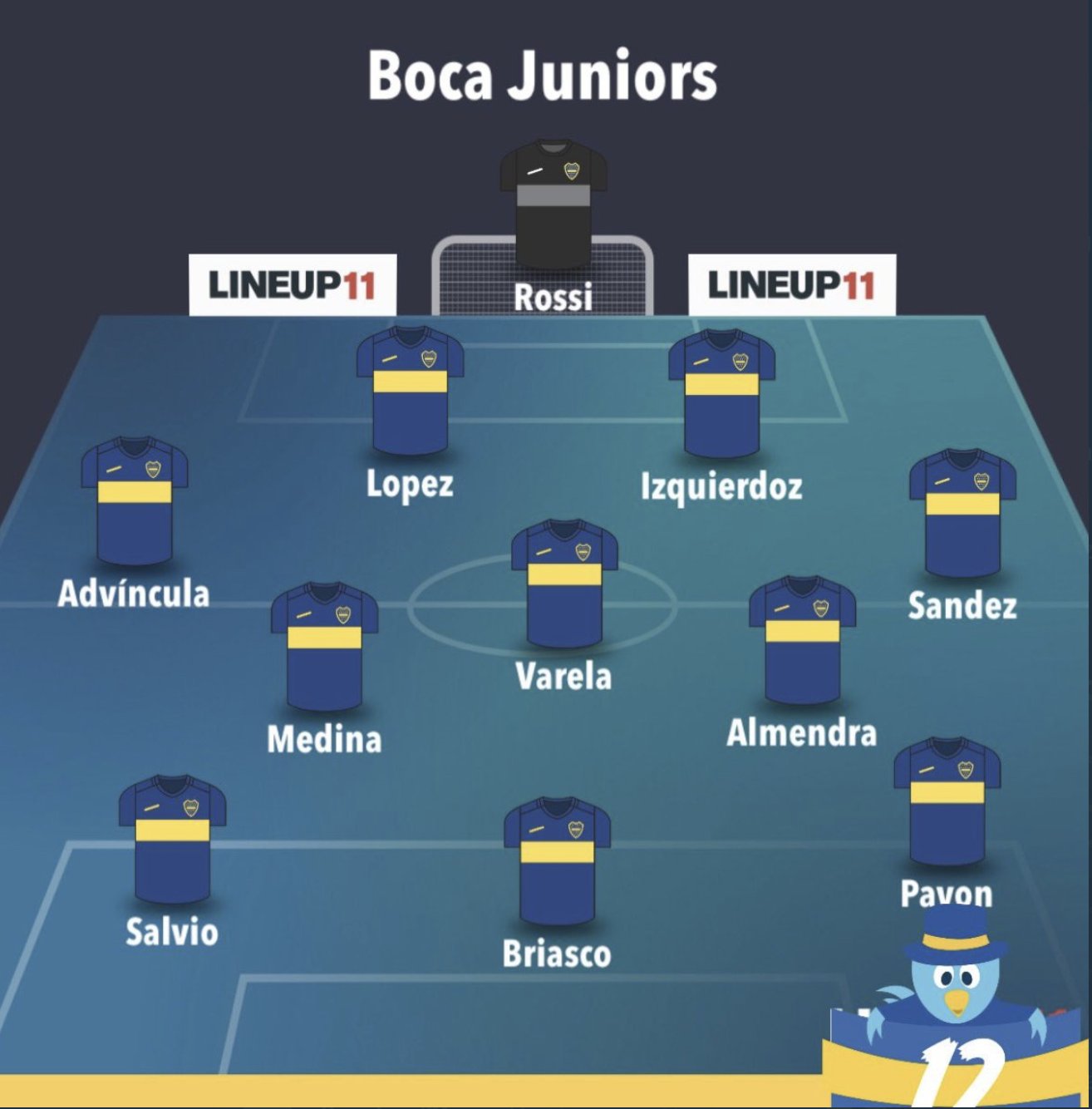 El equipo de Sebastián Battaglia esta noche ante ‘El Rojo’ es el siguiente: “Rossi; Luis Advíncula, López, Izquierdoz y Sandez; Medina, Varela y Almendra; Salvio, Briasco y Pavón”. Carlos Zambrano espera en la banca de suplentes.