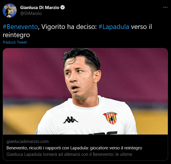 “El Benevento se prepara para reincorporar a Gianluca Lapadula: tras la exclusión de la plantilla, que llegó durante el mercado de invierno de fichajes por diferencias con el club, el delantero ítalo-peruano volverá a los entrenamientos con la región de Campania. Una decisión del presidente Vigorito”. Menciona al principio del párrafo noticioso. Dejando en claro que los malos resultados, favorecen en esta oportunidad a nuestro crack. Bien por él. Nos pone felices.