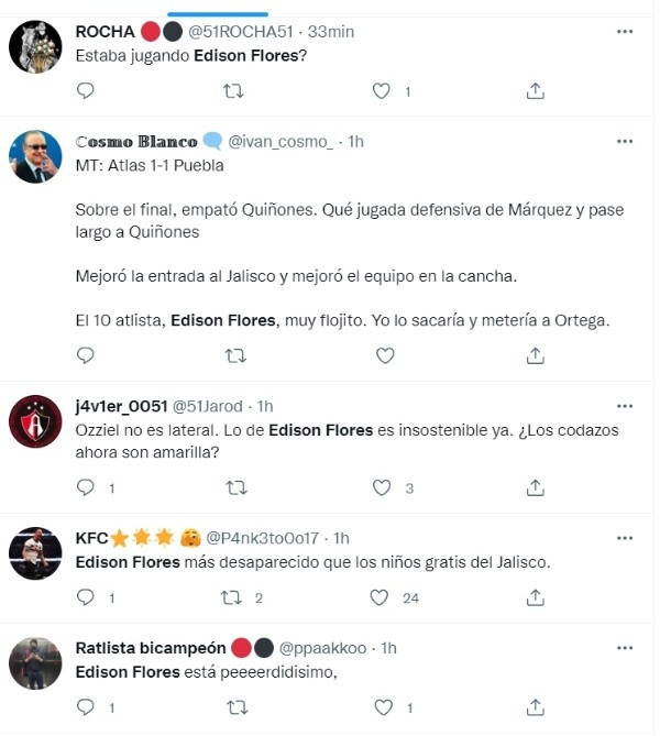 Quizá por este malestar, los hinchas del Atlas destruyeron en redes sociales a Edison Flores. No cuestionando su titularato, lo que sí criticaron fue su accionar ante Puebla. No mostrando un buen juego en el estadio Jalisco ante sus ojos, los sarcásticos adjetivos inundaron la red social Twitter.