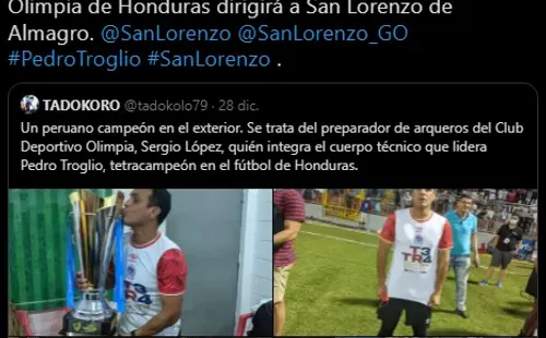 “Sergio López, el preparador de arqueros peruano, así como el cuerpo técnico de Rulo, vuelven a Argentina. Después de haber sido tetracampeón con Olimpia de Honduras dirigirá a San Lorenzo de Almagro”. Será orgullo para todos los peruanos, si le va bien al profesor López, desde aquí los mejores deseos para que cumplan sus objetivos.