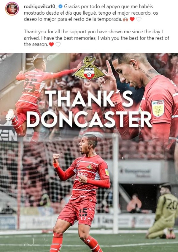Rodrigo Vilca se despidió este miércoles del Doncaster Roversmediante sus redes sociales y le agradeció a los hinchas ingleses por todo su apoyo hasta la fecha. De esta manera, el mediocampista peruano deberá volver al Newcastle y podría estar cerca de ser cedido a préstamo a Alianza Lima.