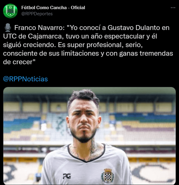 Se mostró contento por verlo ya establecido en el fútbol de más alto rendimiento. ‘Pochito’ es sinónimo de sacrificio para Navarro: “Gustavo Dulanto se ha ganado un lugar en el Sheriff Tiraspol, ahora lo vemos jugar en la Champions League con mucho éxito con un equipo que muchos creían que no tenía ninguna chance”.