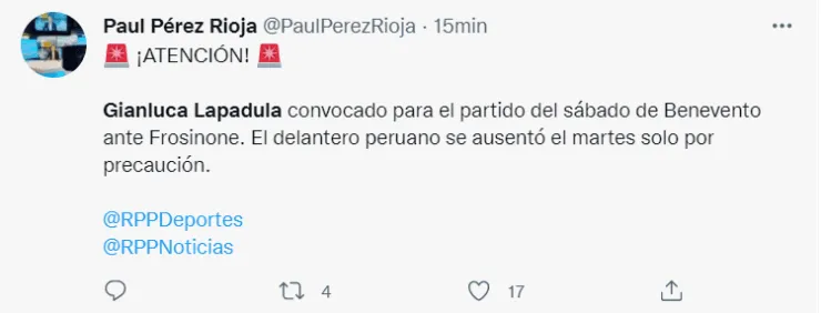 “Gianluca Lapadula convocado para el partido del sábado de Benevento ante Frosinone. El delantero peruano se ausentó el martes solo por precaución”, fue el mensaje publicado por el periodista Paul Pérez Rioja de RPP en su cuenta de Twitter.
