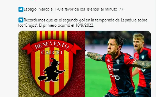 Cagliari derrotó al Benevento con gol del ítalo peruano, Gianluca Lapadula. El atacante le anotó a su ex equipo y lo celebró con mucha euforia, porque este triunfo es muy importante para su equipo, que se encuentra en zona de los playoffs para luchar por llegar a la Serie A.