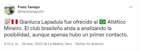 El periodista Franz Tamayo agregó, en su cuenta de Twitter, que un equipo sudamericano podría estar en los planes del atacante peruano: “Gianluca Lapadula fue ofrecido al Atlético Mineiro. El club brasileño anda analizando la posibilidad, aunque apenas hubo un primer contacto”. Cabe resaltar que este conjunto cuenta con el delantero Hulk como estrella y Diego Costa rescindió su contrato hace muy poco con los ‘Galos’.