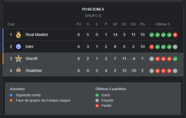 El Sheriff Tiraspol fue parte del Grupo D, donde compartió con dos gigantes como son: Real Madrid e Inter de Milán. Y una sorpresa recurrente dentro de estas competencias, el histórico Shakhtar Donetsk de Ucrania.