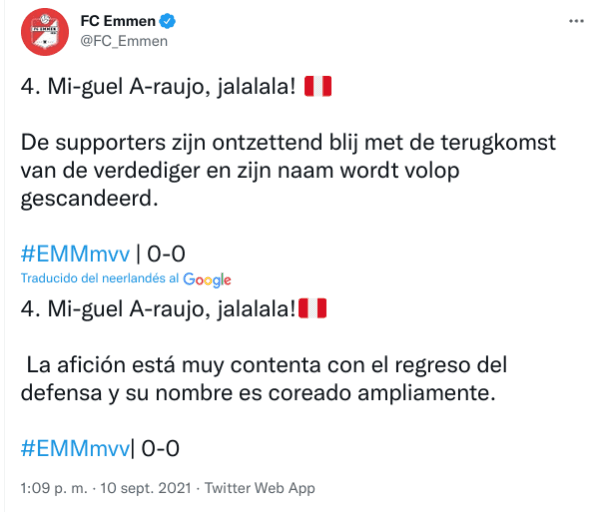 Y es que el peruano jugó los 90′ en el encuentro que su equipo ganó 7-1. Fue en el marco de la fecha 6 y del segundo triunfo del Emmen en la segunda, en donde está décimo primero. Hay que decir, además, que el zaguero fue ovacionado, según lo relató el propio equipo en las redes sociales ¡Buena Miguel!