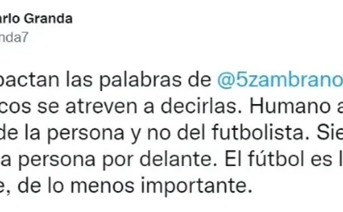El periodista de GOLPERU, Giancarlo Granda, se refirió sobre lo que dijo el defensor central que declaró hace muy pocos días sobre su posible retiro: “Quizás impactan las palabras de Carlos Zambrano porque pocos se atreven a decirlas. Humano al 100%, hablando de la persona y no del futbolista. Siempre, siempre la persona por delante. El fútbol es lo más importante, de lo menos importante”, publico el popular ‘Flaco’ en su cuenta de Twitter.