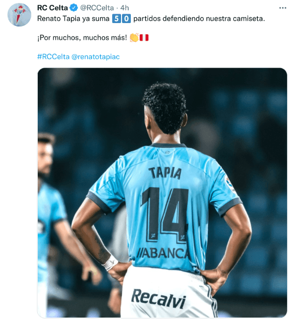 Este viernes, en la cuenta oficial del Celta le dedicaron un posteo: “Renato Tapia ya suma 50 partidos defendiendo nuestra camiseta. ¡Por muchos, muchos más!”. Esto deja claro que prácticamente ha jugado todas las semanas desde que llegó ¡Impresionante!