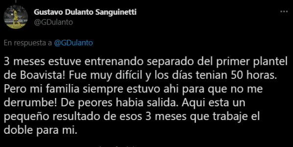 “3 meses estuve entrenando separado del primer plantel de Boavista. Fue muy difícil y los días tenían 50 horas. ¡Pero mi familia siempre estuvo ahí para que no me derrumbe! De peores había salida. Aquí está un pequeño resultado de esos 3 meses que trabaje el doble para mí”.