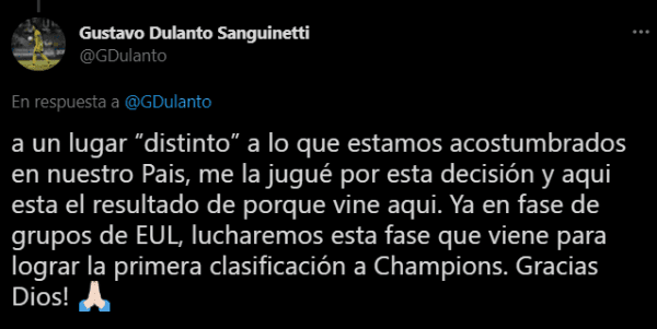 “A un lugar “distinto” a lo que estamos acostumbrados en nuestro País, me la jugué por esta decisión y aquí está el resultado de porque vine aquí. Ya en fase de grupos de EUL, lucharemos esta fase que viene para lograr la primera clasificación a Champions. ¡Gracias Dios!”.