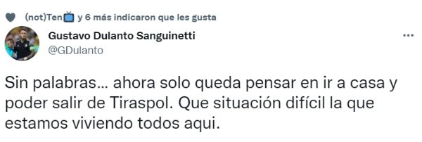 Ahora para Gustavo Dulanto, debido a la tensión mundial que se vive a partir de la invasión de Rusia sobre Ucrania, la situación en Moldavia es incierta al estar tan cerca de la zona de guerra. Por ello el peruano ha colocado en su Twitter una frase tan reveladora como preocupante: “Sin palabras. Ahora solo queda pensar en ir a casa y poder salir de Tiraspol. Qué situación difícil la que estamos viviendo todos aquí“.