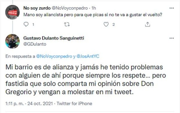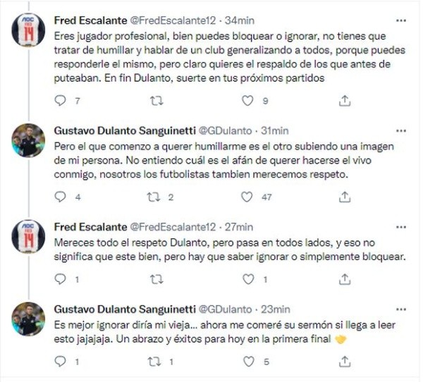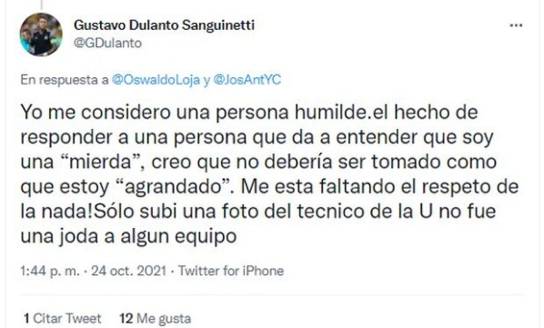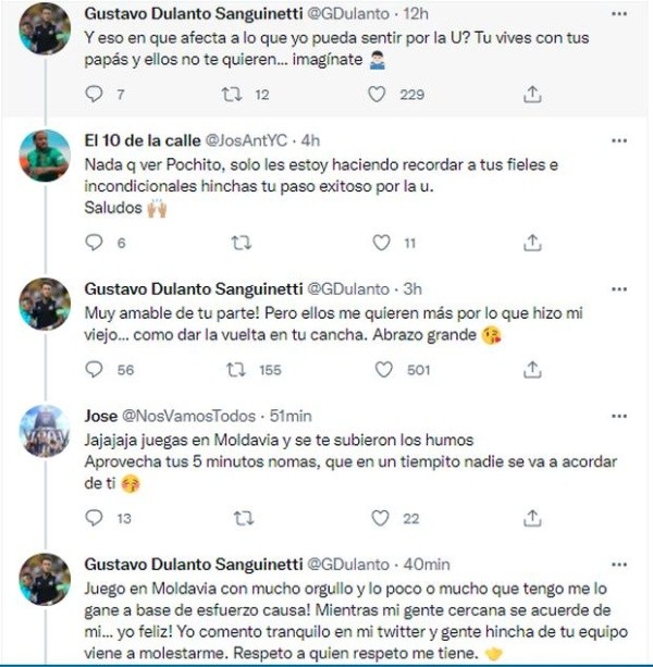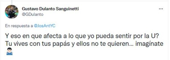 Escribiendo en principio lo siguiente el zaguero: “¿Y eso en qué afecta a lo que yo pueda sentir por la U? Tú vives con tus papás y ellos no te quieren. Imagínate”. Recibiendo una respuesta bastante ambigua, que tuvo una contestación más fuerte por parte de Gustavo Dulanto, quien le dijo esto.