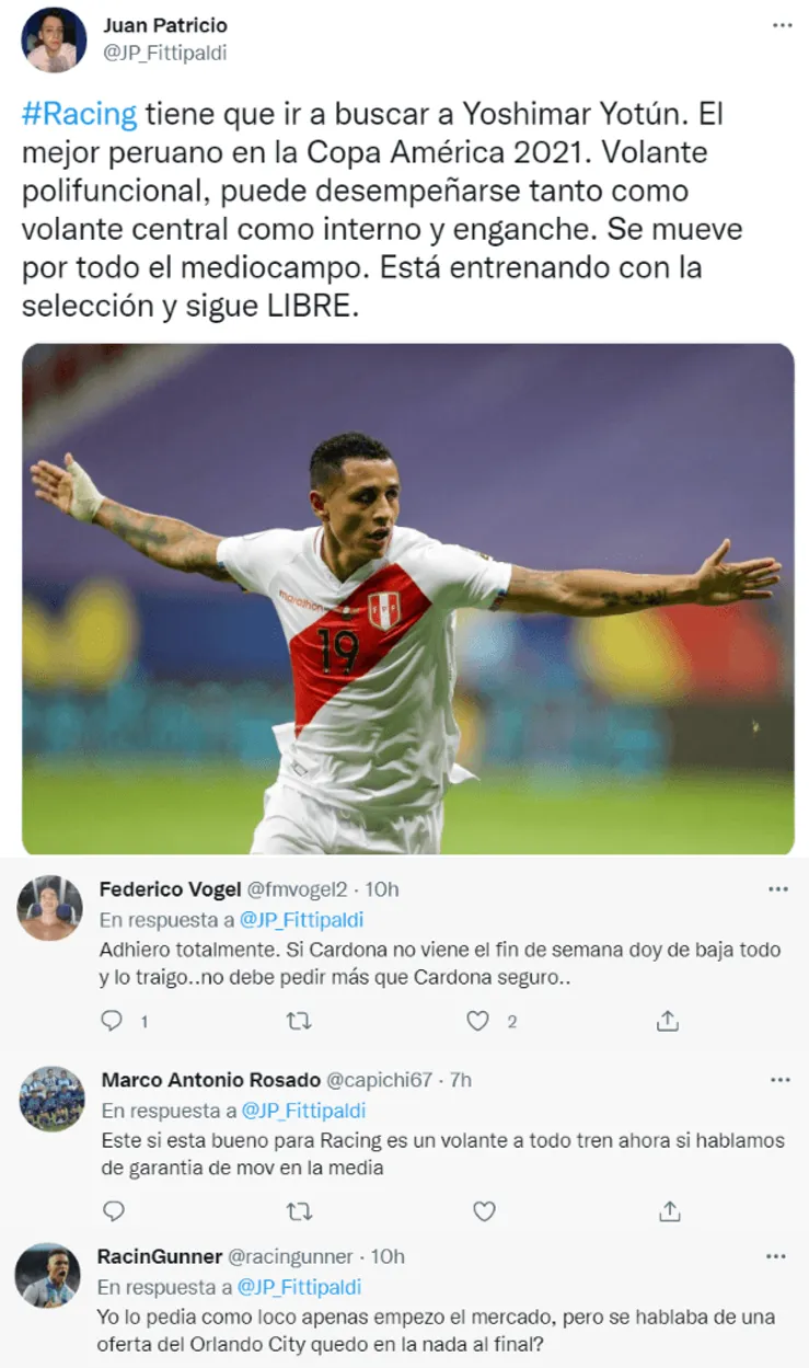 “Racing tiene que ir a buscar a Yoshimar Yotún. El mejor peruano en la Copa América 2021. Volante polifuncional, puede desempeñarse tanto como volante central como interno y enganche. Se mueve por todo el mediocampo. Está entrenando con la selección y sigue libre”, mencionó un usuario de Twitter. Otro agregó “Adhiero totalmente. Si Cardona no viene el fin de semana doy de baja todo y lo traigo…no debe pedir más que Cardona seguro”.