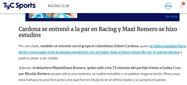 “El delantero Maximiliano Romero, quien salió a los 72 minutos del partido frente a Godoy Cruz por Nicolás Reniero ya que sufrió una molestia, se realizó estudios y no padece ninguna lesión. Pese a eso, esta mañana no practicó junto a los que fueron titulares en el último duelo y se sumaría el jueves”, informa el citado portal TyC Sports en su página web.