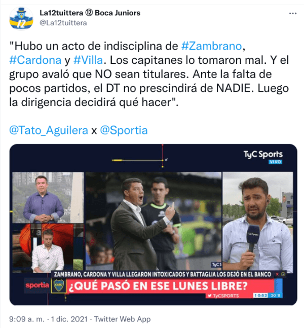 “Hubo un acto de indisciplina de Zambrano, Cardona y Villa. Los capitanes lo tomaron mal. Y el grupo avaló que NO sean titulares. Ante la falta de pocos partidos, el DT no prescindirá de NADIE. Luego la dirigencia decidirá qué hacer”, señaló el mencionado comunicador ¡Ay Kaiser!