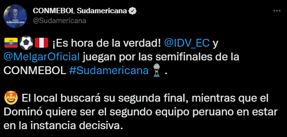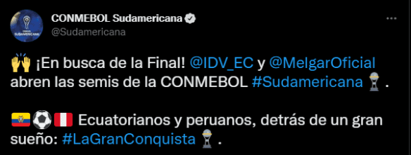La primera publicación del día nos dice lo siguiente. Desde un ámbito bastante más neutral, pero lleno de emociones, para poder comprender lo que se vivirá más tarde en territorio ‘norteño’: “¡En busca de la Final! Independiente del Valle y FBC Melgar abren las semis de la CONMEBOL Sudamericana. Ecuatorianos y peruanos, detrás de un gran sueño: La gran conquista”.