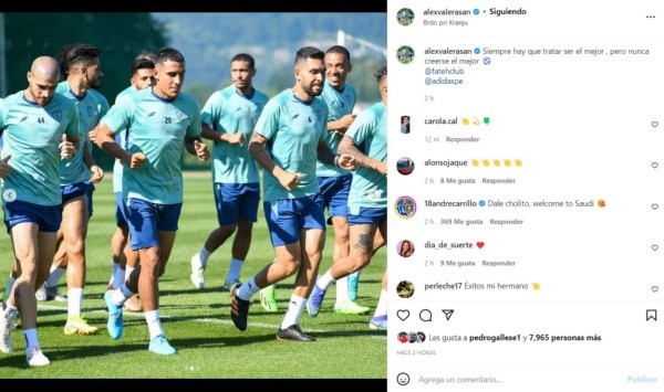 “Siempre hay que tratar de ser el mejor, pero nunca creerse el mejor“, comentó Alex Valera en su cuenta de redes sociales. Publicándola en su Instagram, la interacción rápidamente tuvo repercusiones y hasta André Carrillo le envió un mensaje: “Bienvenido a Arabia Saudita”.