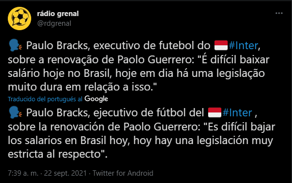 Paulo Bracks, ejecutivo de fútbol en Inter de Porto Alegre, en una nota con ‘Radio GreNal’ precisó: “Es difícil bajar los salarios en Brasil hoy, hoy hay una legislación muy estricta al respecto”. Lo cual dejaría como luz, una posible ruptura de negociaciones a una posible renovación.