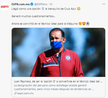 Las editoriales de opinión e información deportiva en México lo señalaron como ‘un DT no capacitado para dirigir a Cruz Azul’. Revelando hechos innecesarios como decir: “Juan Reynoso llegó cuatro días antes de iniciar el Guard1anes 2021. La demora fue porque el Cruz Azul tocó las puertas de Antonio ‘Turco’ Mohamed, Matías Almeyda y Hugo Sánchez”.