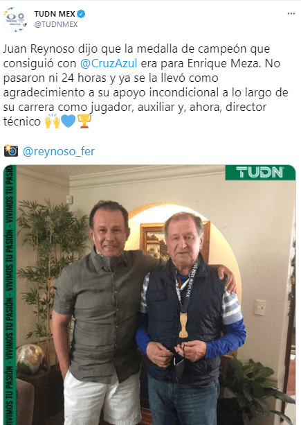 Por eso esta mañana Juan Reynoso se juntó con su mentor, así lo hizo saber ‘TUDN MÉXICO’: “Juan Reynoso dijo que la medalla de campeón que consiguió con Cruz Azul era para Enrique Meza. No pasaron ni 24 horas y ya se la llevó como agradecimiento a su apoyo incondicional a lo largo de su carrera como jugador, auxiliar y, ahora, director técnico”. Un gesto muy emotivo por parte del ídolo cementero.