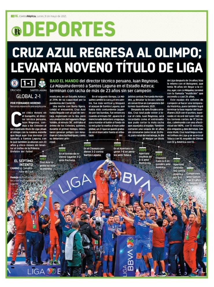 Diversos medios de comunicación en su versión papel y digital han hecho portadas conmemorativas al reciente campeonato de Cruz Azul. Con Juan Reynoso a la cabeza, y revelando la trascendencia del director técnico peruano a lo largo de la presente temporada. El tiempo puso en su lugar a ‘El cabezón’, quien en silencio forjó una historia imborrable.