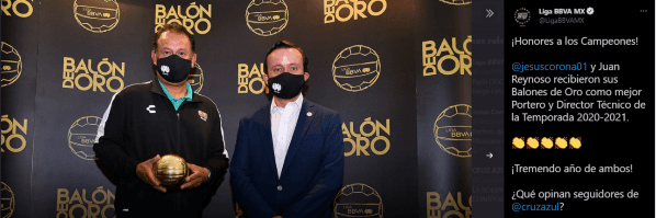 En una publicación de Twitter se hizo viral este premio para el ex FBC Melgar, Bolognesi y Universitario de Deportes: “¡Honores a los Campeones! Jesús Corona y Juan Reynoso recibieron sus Balones de Oro como mejor Portero y director técnico de la Temporada 2020-2021. ¡Tremendo año de ambos!”.