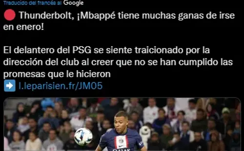 De la misma manera, dos fuentes fuertes corroboran lo colocado. El primero es ‘Le Parisien’, considerado como el tribunal de opinión del club francés en el mundo de las comunicaciones. Ahí mencionan esto: “Thunderbolt, ¡Mbappé tiene muchas ganas de irse en enero! El delantero del PSG se siente traicionado por la dirección del club al creer que no se han cumplido las promesas que le hicieron”.