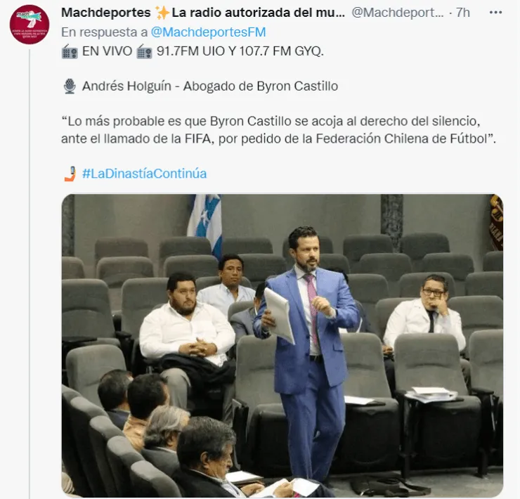 “Lo más probable es que Byron Castillo se acoja al derecho del silencio, ante el llamado de la FIFA, por pedido de la Federación Chilena de Fútbol. Byron me tendrá que dar un poder para representarlo. Si la FIFA desea me puedo presentar, al igual que el abogado que lo representó ante el Registro civil”, dijo el abogado de Byron.