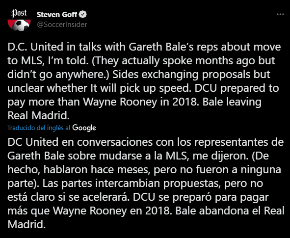 El reporte entregado por el periodista Steven Goff, señala que: “DC United se mantiene en conversaciones con los representantes de Gareth Bale para ofrecerles la oportunidad de mudarse a la MLS una vez su contrato con el Real Madrid finalice”. Lo cual, obviamente, sería una noticia mundial.