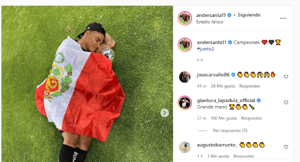 Donde aparecía en el césped junto a la gran copa ganada. Junto a un texto corto, pero emotivo: “Campeones. #junto2”. Ahí recibió el saludo de varios compañeros en ‘La Blanquirroja’. Como es el caso de José Carvallo, Gianluca Lapadula, entre otros deportistas más. Bien por el nacido en Huánuco, estamos felices por él.