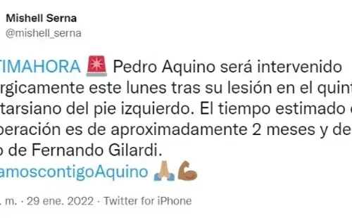 La periodista Mishell Serna informó, en su cuenta de Twitter, lo que le espera a ‘La Roca’ para recuperarse: “Pedro Aquino será intervenido quirúrgicamente este lunes tras su lesión en el quinto metatarsiano del pie izquierdo. El tiempo estimado de recuperación es de aproximadamente de 2 meses y de la mano de Fernando Gilardi”, comentó
