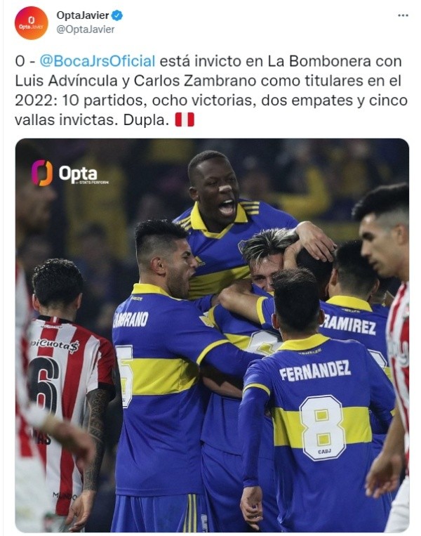“Boca Juniors está invicto en La Bombonera con Luis Advíncula y Carlos Zambrano como titulares en el 2022: 10 partidos, ocho victorias, dos empates y cinco vallas invictas. Dupla”, menciona la cuenta de OptaJavier en redes sociales.
