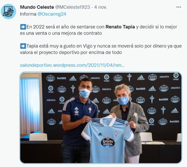 El periodista del ‘Faro de Vigo’, Óscar Méndez, y colaborador de ‘Mundo Celeste’, dijo que en el club definirán el futuro de Renato Tapia en los siguiente meses. Pues si bien el peruano es un buen ingreso económico para la institución si es que llega a ser vendido, su actual momento con la Selección Peruana bajaría su precio de no clasificar al Mundial de Qatar 2022.