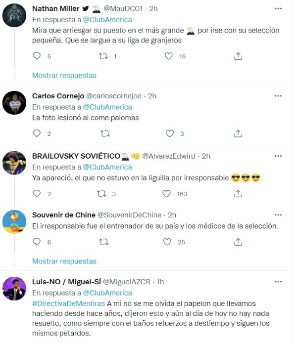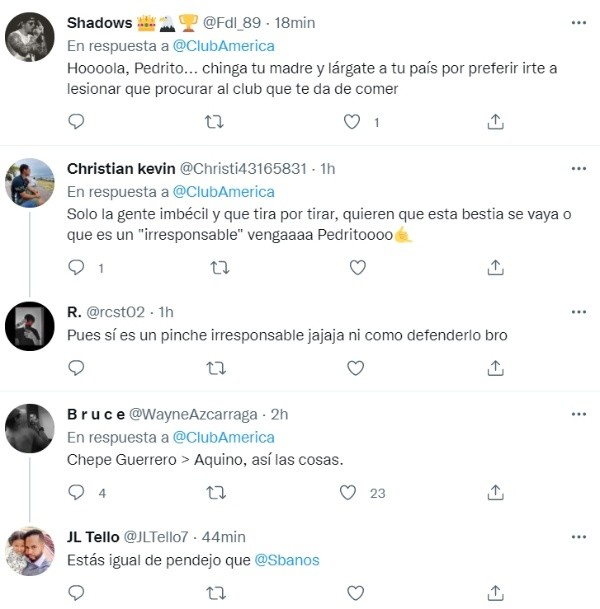 “Mira que arriesgar su puesto en el más grande por irse con su selección pequeña. Qué se largue a su liga de granjeros“, mencionó un usuario. Otro publicó: “Ya apareció, el que no estuvo en la liguilla por irresponsable“. Uno más dijo: “Hola, Pedrito. Chinga tu madre y lárgate a tu país por preferir irte a lesionar que procurar al club que te da de comer“.