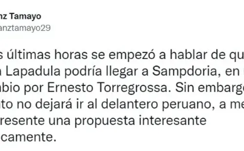 El periodista Franz Tamayo informó que un equipo de la Serie A estaría interesado en el atacante de la Selección Peruana: “En las últimas horas se empezó a hablar de que Gianluca Lapadula podría llegar a Sampdoria, en un intercambio por Ernesto Torregrossa, Sin embargo, Benevento no dejará ir al delantero peruano, a menos que se presente una propuesta interesante económicamente”, publicó en su cuenta de Twitter.