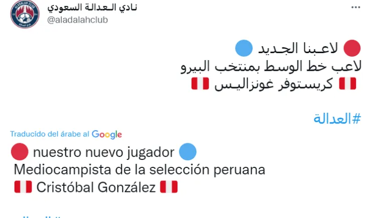Al-Adalah, equipo árabe que acaba defichar al peruano Christofer Gonzáles,presentó oficialmente a ‘Canchita’ como su nuevo refuerzo, por medio de sus redes sociales oficiales. Cabe resaltar que a pesar de la buena intención del club saudí con el video de presentación del peruano,se pudo observar un pequeño error a la hora de mencionar el nombre del futbolista.