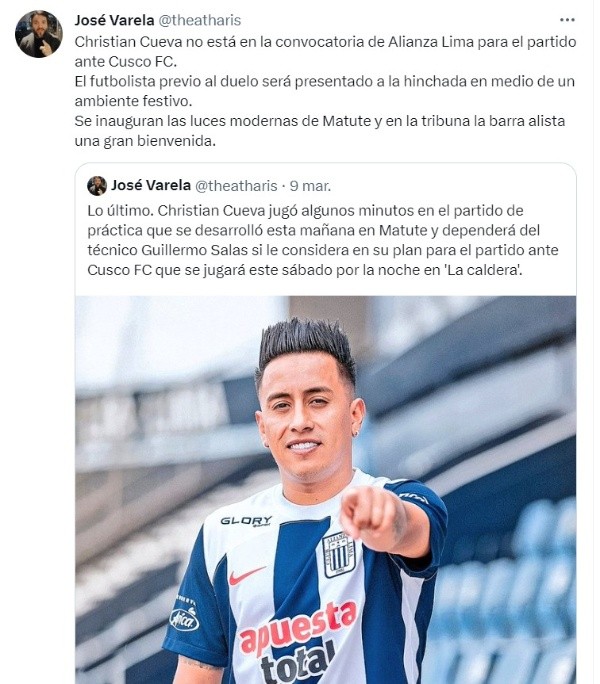 Lo que sí sucederá, según el hombre de prensa, será que el volante Christian Cueva estará en el estadio Alejandro Villanueva. Siendo presentado en el entretiempo del cotejo ante Cusco FC, o quizá antes del partido, se espera un show y luego su salida a la cancha de Matute.