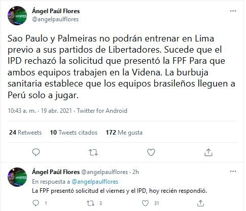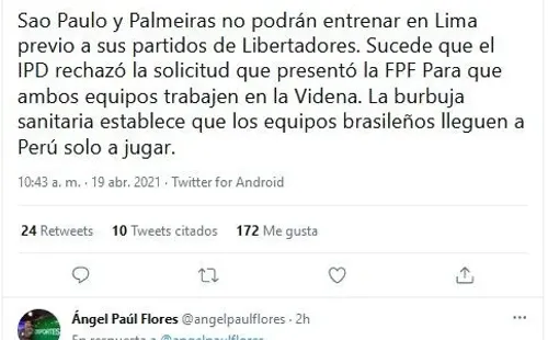 “Sao Paulo y Palmeiras no podrán entrenar en Lima previo a sus partidos de Libertadores. Sucede que el IPD rechazó la solicitud que presentó la FPF Para que ambos equipos trabajen en la Videna. La burbuja sanitaria establece que los equipos brasileños lleguen a Perú solo a jugar”, informó Ángel Paul Flores.