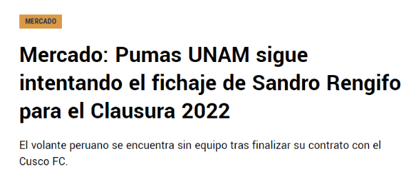 La información llega desde México donde destacan lo siguiente: “Entre los tantos nombres que han desfilado por los medios de prensa destaca el de Sandro Rengifo. El jugador peruano fue colocado en la órbita de los universitarios por la misma prensa andina”. Pues se conoce que, desde inicios del mes de diciembre, su nombre fue acercado al cuadro estudiantil.