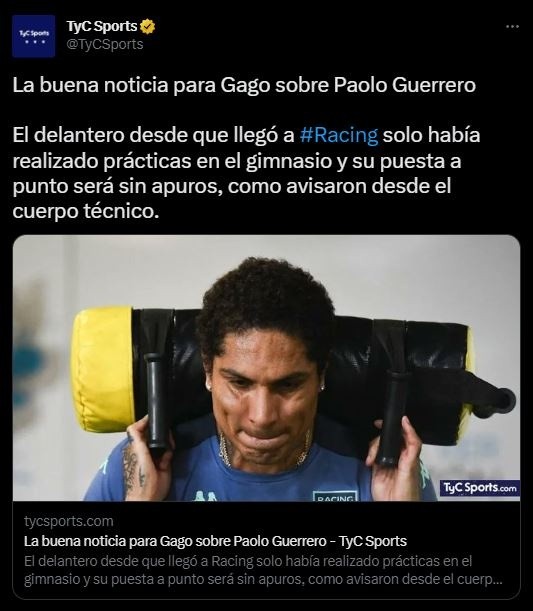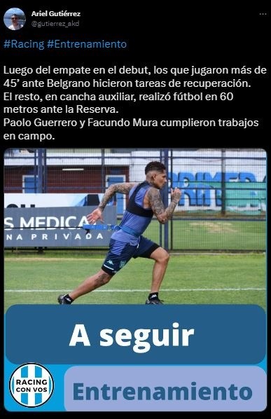 Desde TyC Sports, amplían el detallado, donde se pueden ver movimientos positivos para nuestro compatriota: “Paolo Guerrero, el delantero peruano, trabajó hoy por primera vez a la par del grupo en el entrenamiento de Racing en el predio Tita Mattiussi, luego de que se haya incorporado a las prácticas la semana pasada, cuando se confirmó como nuevo refuerzo de los dirigidos por Fernando Gago”.