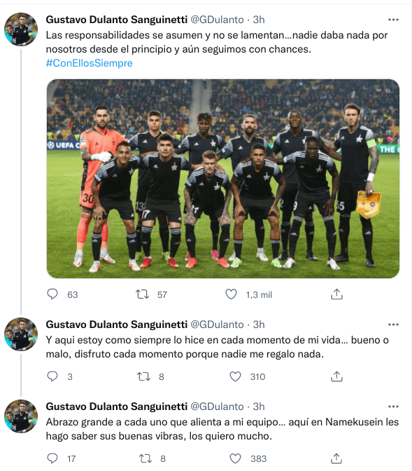 “Las responsabilidades se asumen y no se lamentan…nadie daba nada por nosotros desde el principio y aún seguimos con chances”, comenzó escribiendo. “Y aqui estoy como siempre lo hice en cada momento de mi vida… bueno o malo, disfruto cada momento porque nadie me regalo nada”, complementó en otro tweet.