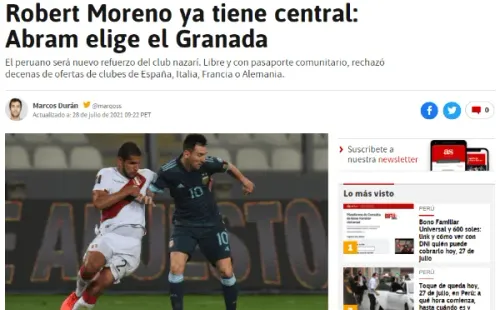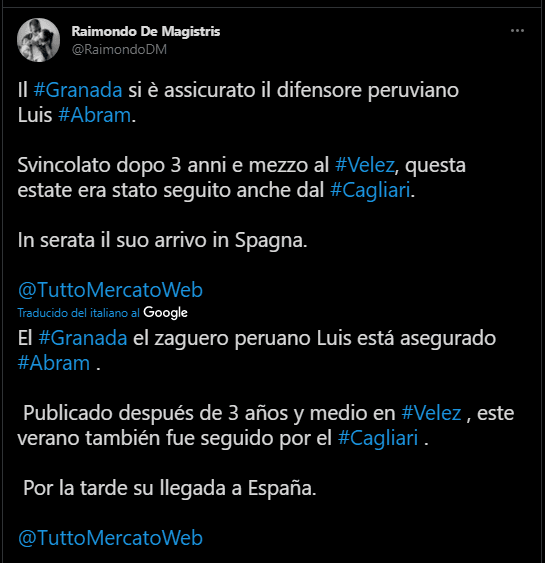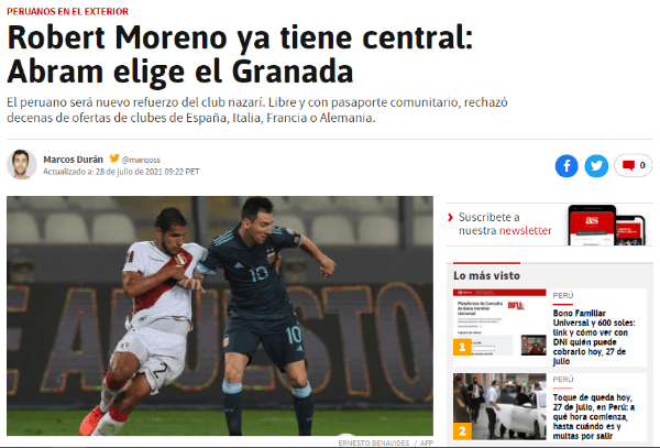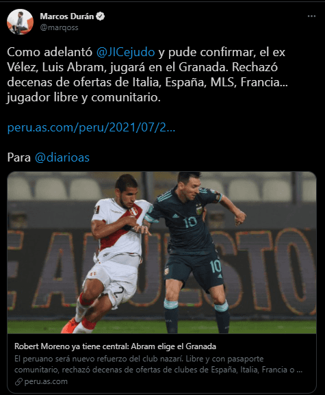 Después pasaron cayendo más datos al respecto. Al final todos coinciden en una sola idea. Luis Abram jugará en Granada, tras rechazar un número importante de ofertas. Lo cual le da valor a su carrera más reciente, porque se hizo un nombre en Vélez Sarsfield, y en la Selección Peruana fue importante.