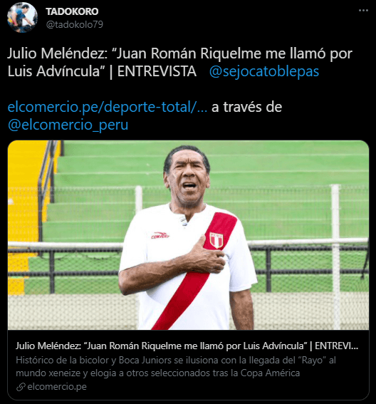 ‘El Negro’ como se le conoce desde siempre, confesó que Juan Román Riquelme, hoy el encargado del fútbol en Boca Juniors, le consultó sobre Luis Advíncula, lo cual causó una gran sorpresa en su persona, pero se sintió muy dichoso por el respeto con el que se forjó esta llamada.
