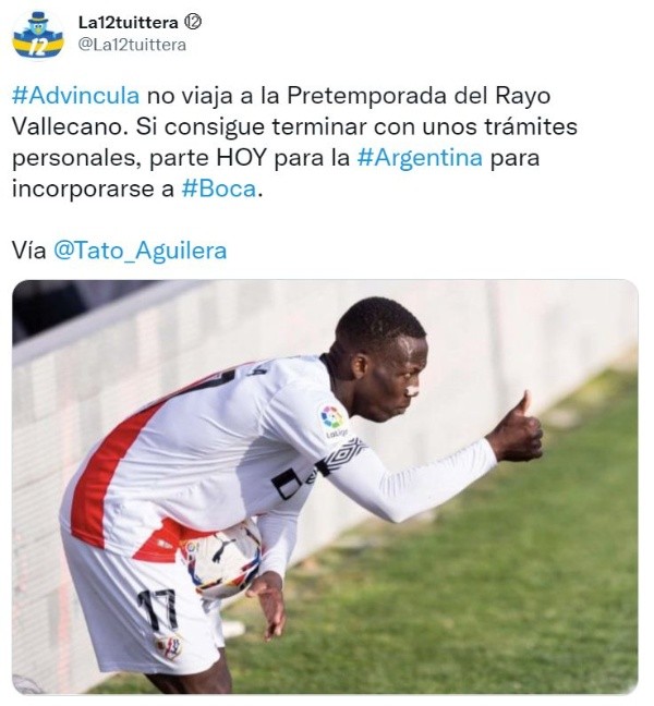 Luis Advínculaestá cada vez más cerca de Boca Juniors. El lateral derecho no viajó con el Rayo Vallecano a Marbella, para realizar la pretemporada, y esto indicaría que tendría todo arreglado con los ‘xeneizes’ para mudarse a Argentina. Lo más seguro es que el día de mañana, el jugador peruano sea anunciado como nuevo fichaje.