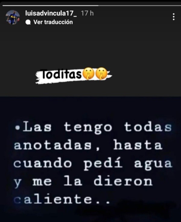 ‘Leo Benítez’ es conocido comunicador e hincha de Boca Juniors, quien tomó captura de este hecho y publicó el mensaje de ‘Lucho’, donde se puede ver: “Toditas. Las tengo todas anotadas, hasta cuando pedí agua y me dieron caliente…” ¿Para quién será esta advertencia de Advíncula? Solo el tiempo lo sabrá.