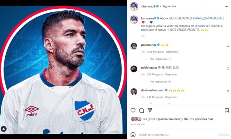 “Ahora sí, oficialmente Suárez en Nacional. Un orgullo volver a vestir mi camiseta en Nacional. Gracias a todos por el apoyo. Nos vemos pronto.La ilusión de todos, el amor por los colores y la alegría de volver a verte con la camiseta más linda del mundo. ¡Felices de tenerte en casa!”, fue el mensaje publicado por el jugador de la selección uruguaya.