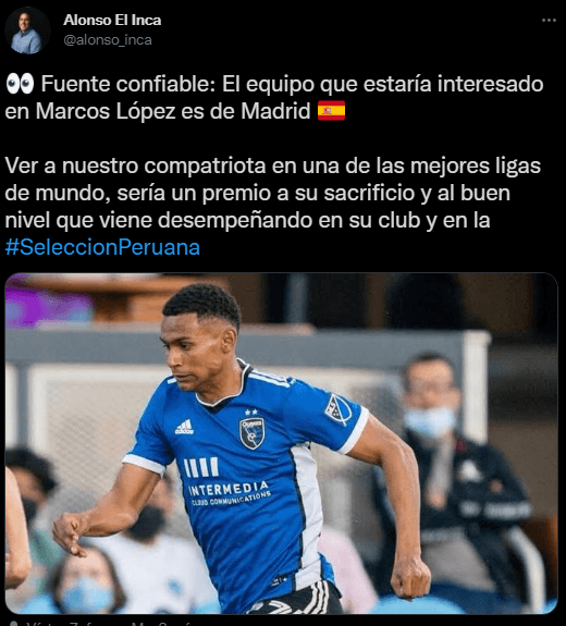 “Fuente confiable: El equipo que estaría interesado en Marcos López es de Madrid. Ver a nuestro compatriota en una de las mejores ligas de mundo, sería un premio a su sacrificio y al buen nivel que viene desempeñando en su club y en la #SeleccionPeruana”.