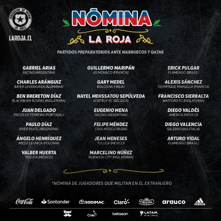 Chile continúa confiando en su núcleo establecido de jugadores clave, con Gary Medel, Arturo Vidal y Alexis Sánchez todos convocados. Se espera que jueguen en la columna vertebral, cada uno con más de 130 partidos internacionales. Este último encabeza la tabla de goleadores de todos los tiempos de su país con 48 goles, y debería liderar nuevamente el ataque junto a Ben Brereton Díaz, quien ha anotado 4 goles en 15 partidos desde que declaró su amor por ‘La Roja’, mientras que Charles Aránguiz, Erick Pulgar y Marcelino Núñez luchará por unirse a Vidal en la sala de máquinas.